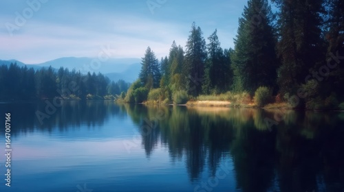 Landscape photograph of a lake surrounded by trees. the lake is calm and still, reflecting the trees and mountains in the water.