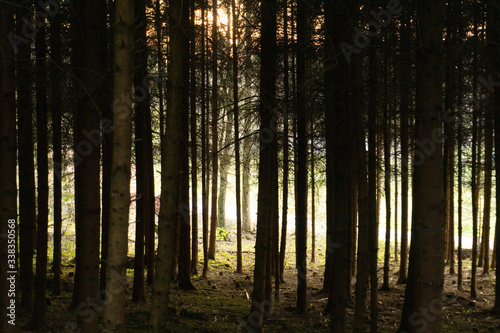 Landscape picture of a forest with sunset with dark fir trees and the sun with rays between the trees, mostly green and yellow