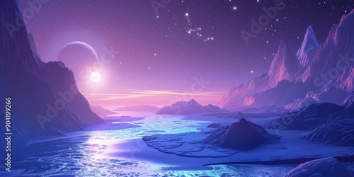 Landscape Planets In The Sky Over Deep Space Ocean Coast. Surreal view of colorful ocean with planets in the sky. Ai generation.
