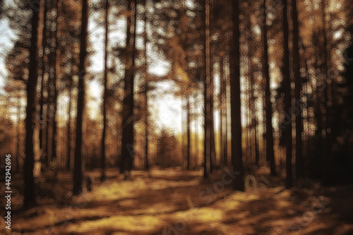landscape summer forest glare sun bokeh blurred background, abstract view of trees