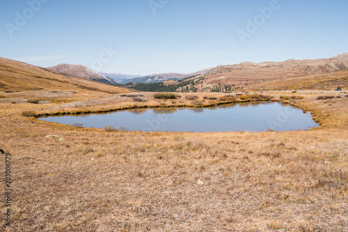 landscape view at Independence Pass near Aspen, Colorado of mountains and a pond.