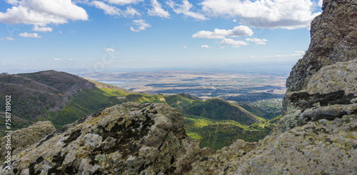 Landscape view from the ruins of Kojori fortress. Bright blue sky and clouds. Mountains, rocks, villages in the valley and a line of clouds on the horizon. Colored bushes and green grass.