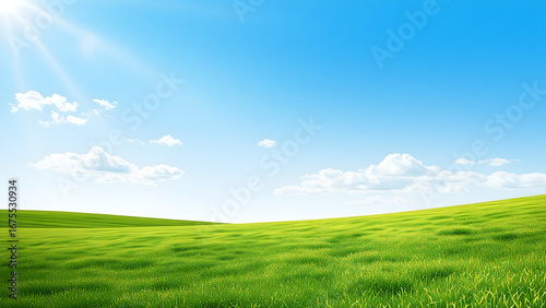 Landscape view of green grass field with bright blue sky background.