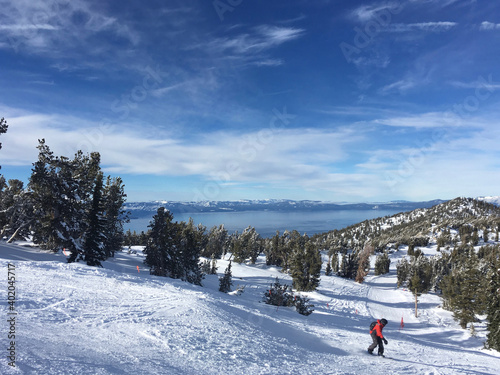 Landscape views of Lake Tahoe from a ski resort, on a cloudy winter day
