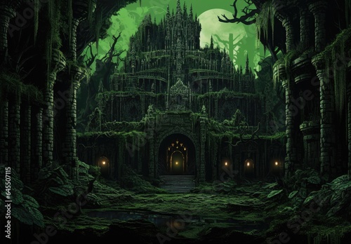 Landscape with a dark medieval castle in the middle of the forest, anime style, greenish tones. Generative AI