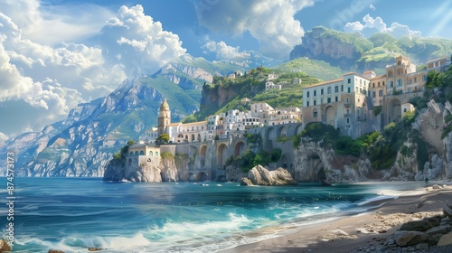 Landscape with atrani town at famous amalfi coast italy. Beach. Ultra realistic. Photorealistic