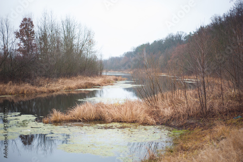 landscape with morning fog in the forest lake