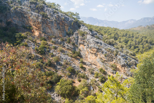 Landscape with pine tree wood forest and rocky mountains above blue sky.Natural background on sunny day
