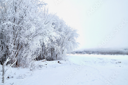 Landscape with tree in the foreground and field in the distance on a winter day