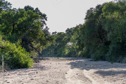 landscape with tyre tracks on dry riverbed and river green shores in shrubland at Kruger park, South Africa