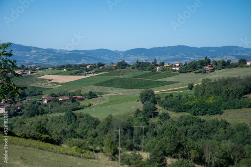 Landscape with vineyards near beaujolais wine making village Val d'Oingt, gateway to Beaujolais Wine Route and hilly landscapes of the Pierres Dorées, France