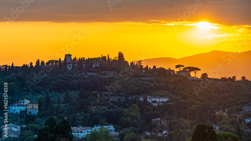 Landschaft der Toskana in Florenz zur Goldenen Stunde bei Sonnenuntergang
