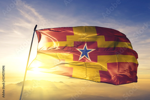Langley of British Columbia of Canada flag waving on the top sunrise mist fog