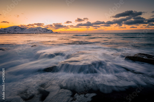 Langzeitbelichtung vom Flakstad Strand auf den Lofoten, Norwegen