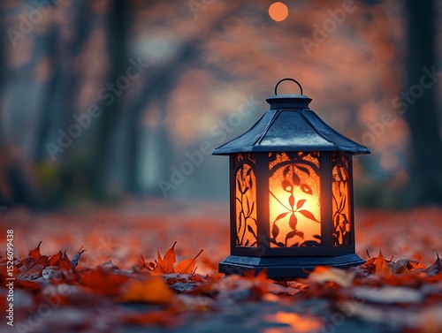 Lantern illuminated amidst fall leaves evoking autumnal serenity and warmth