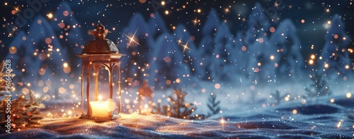 lantern with burning candle in snow on blue starry night sky background, wide banner for card design