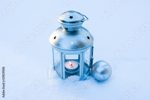 Lantern with burning candles covered with snow and a Christmas ball. Winter mood and Christmas holidays concept