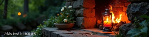 Lantern's flame casts a warm glow on a stone fireplace, peaceful scene, stone fireplace, soft light