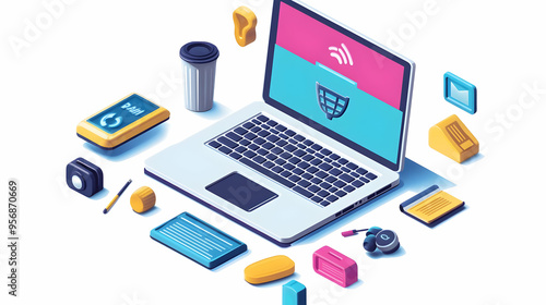 Laptop and Earbuds Icons with Remote Work Ready text isolated on white background concept as Camera movement Focus on the laptop and earbuds icons highlighting readiness for remote work during virtual
