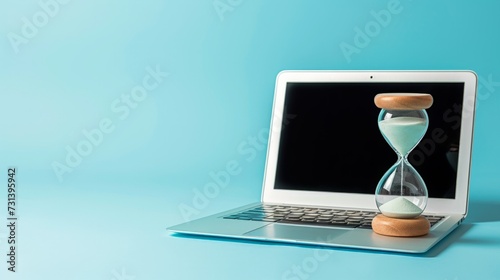 Laptop and hourglass on blue background