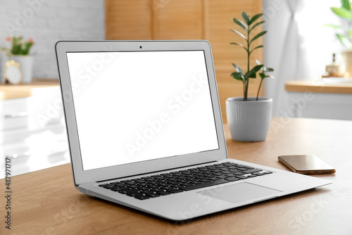 Laptop and mobile phone on wooden table in light room