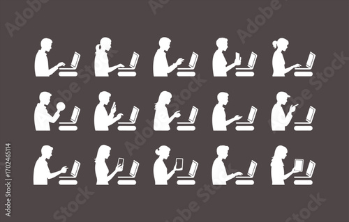 Laptop and smartphone people silhouettes pack, men and women using devices, digital lifestyle work, business communication technology vector set