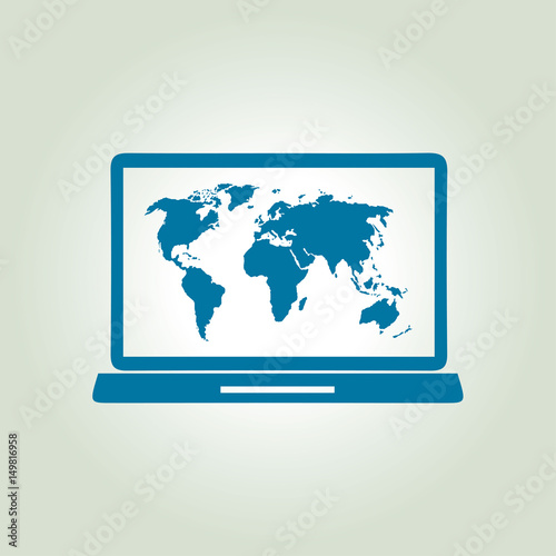 Laptop and world map illustration. World map geography symbol. Flat design style.