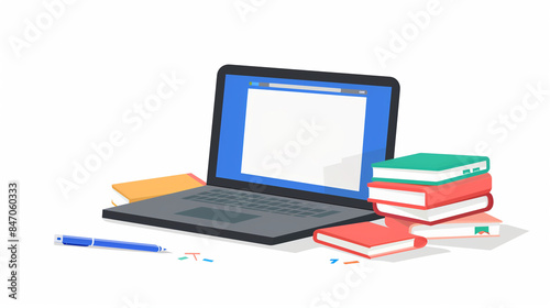 laptop, books, work, research, digital art, workspace, study, online learning, education, modern design, minimalist design, graphic design, computer, book stack, academic, web art, vector illustration