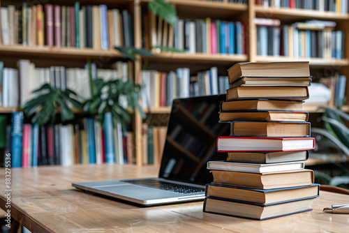laptop computer and stack of books on table in modern office, coffee shop or library background
