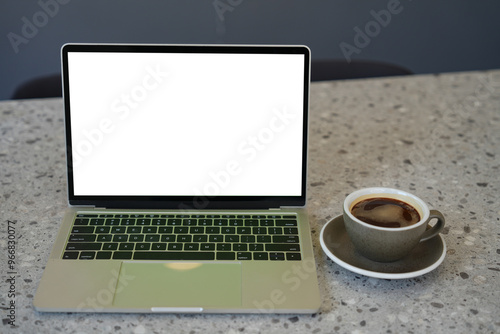 Laptop computer with blank white screen with coffee cup on table. Working business concept.