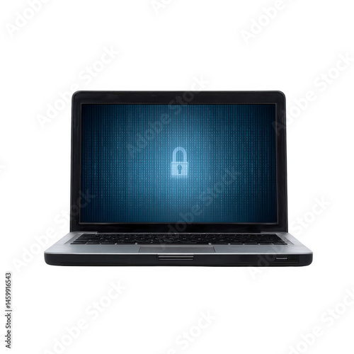 Laptop displaying digital lock symbol on screen, representing cybersecurity and data protection. blue background with binary code emphasizes theme of secure technology