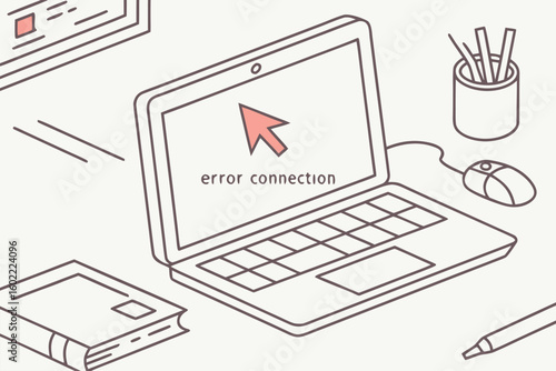 Laptop displaying error connection message while surrounded by stationery, books, and a mouse in a minimalist workspace