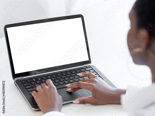 Laptop freelance. Remote work. Online business. PC technology. Woman employee using notebook mockup copy space screen at home office desk workplace.