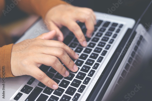 laptop. lifestyle woman close up hand keyboard sit on sofa using a notebook computer to work from home and search information social network online.