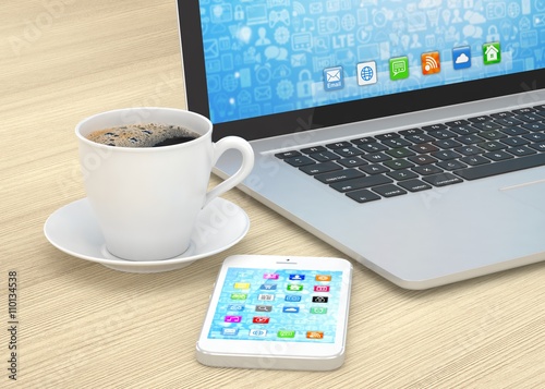 Laptop smartphone and coffee cup on wood. 3d rendering.
