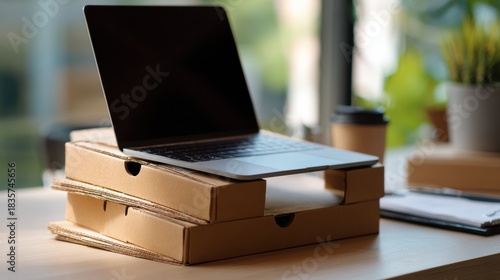 Laptop Stand Packaging Mockup on a Desk in a Coworking Space During Daytime With a Blurred Background