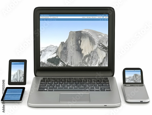 Laptop, Tablet, and Netbook Showcase a Mountain Scene Seamlessly Across Multiple Devices.