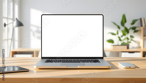 Laptop with a blank screen on a table in a bright home office. Perfect for inserting your own content. 3d render isolated with white highlights, png