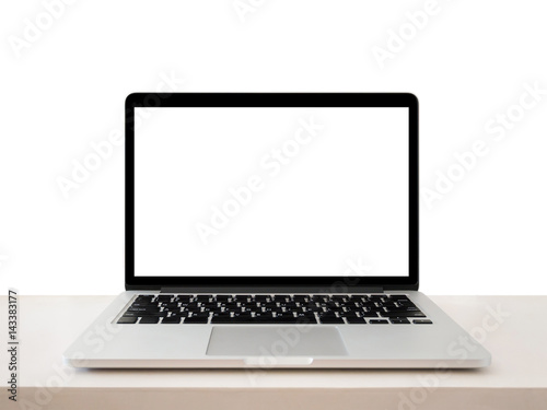 Laptop with blank screen on table