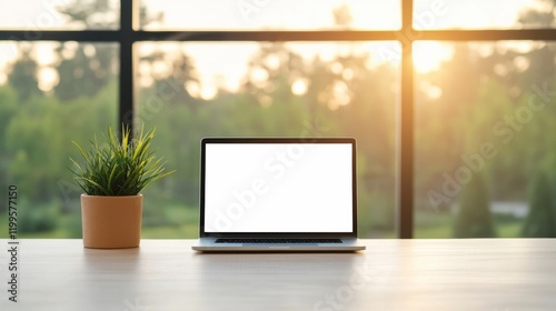 Laptop with blank screen sitting on a wooden desk near a potted plant, in front of large windows with greenery and sunlight