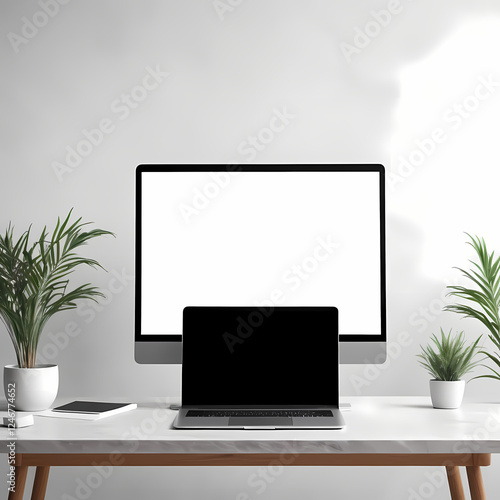 Laptop with Blank White Screen on Desk Against an Abstract Background