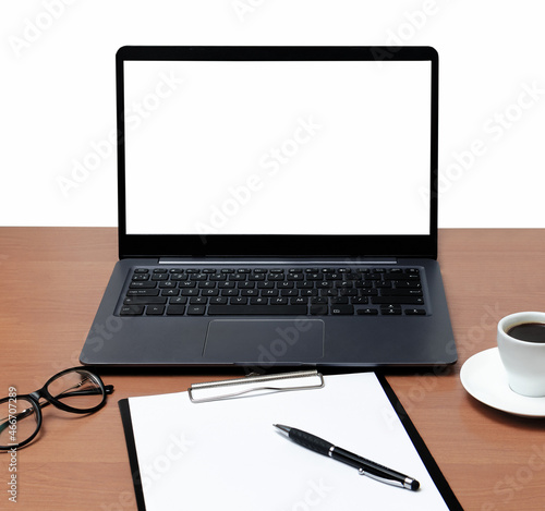 laptop with notebook and pen on wooden table