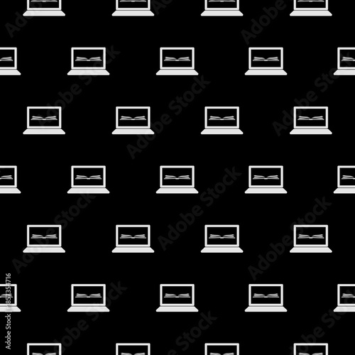 Laptop with open book on screen seamless pattern isolated on black background