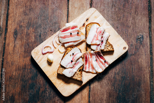Lard with black bread and onions on a wooden board on a tablecloth