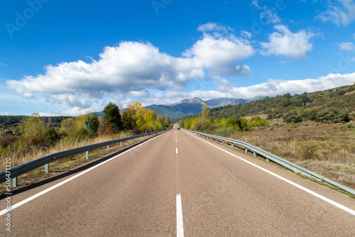 Larga recta en una carretera secundaria y, a lo lejos, árboles con una montaña y nubes en el fondo.
