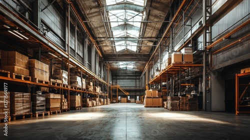 Large and Spacious Warehouse Interior with Stacked Pallets and Shelving
