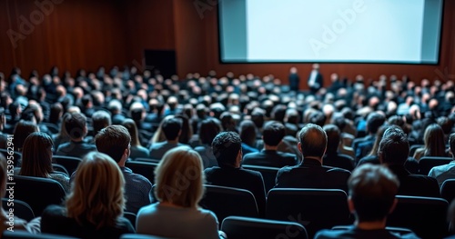 Large audience seated in a lecture hall, attentively listening to a presentation. Speaker visible at the front, projected screen in the background. Full hall