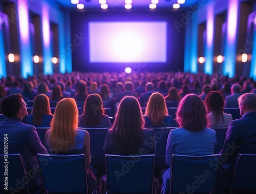 Large audience seated in a modern cinema or conference hall watching a brightly lit screen under glowing purple and blue lights, capturing entertainment, tech events, or film screenings.