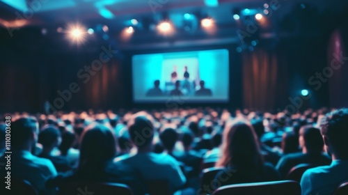 Large auditorium rows people sitting chairs facing stage business conference room