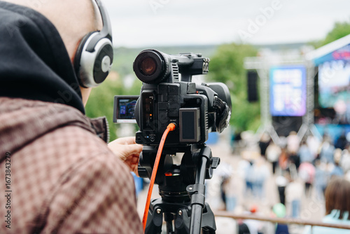 large black video camera on tripod outdoors, operator videographer shooting music festival and crowd of people outdoors, television work